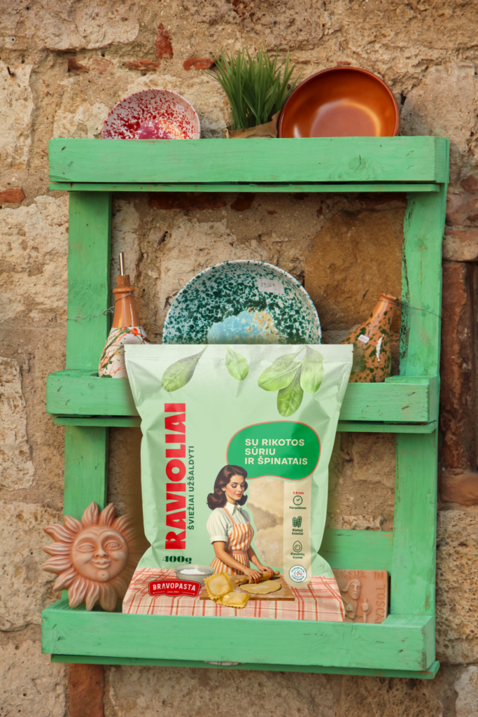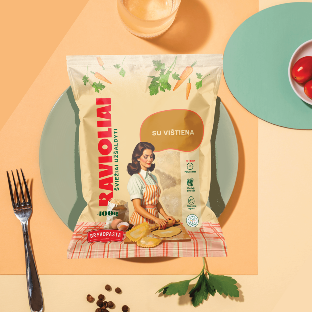 When designing the packaging for Bravo Pasta, I wanted to evoke a nostalgic, 1970s-inspired aesthetic while maintaining a fresh and modern feel. Based on the bright yet soft pastel palette of the time, I created a design that combines vintage charm with modernity. The main focus is a playful illustration of a young woman making pasta, reflecting the warmth and tradition of home-cooked meals. This character adds personality, inviting consumers to immerse themselves in a history of craftsmanship and authenticity. The overall design combines retro elegance with a playful accent, making each variety feel like a special, handmade dish.