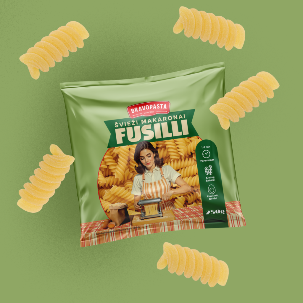 When designing the packaging for Bravo Pasta, I wanted to evoke a nostalgic, 1970s-inspired aesthetic while maintaining a fresh and modern feel. Based on the bright yet soft pastel palette of the time, I created a design that combines vintage charm with modernity. The main focus is a playful illustration of a young woman making pasta, reflecting the warmth and tradition of home-cooked meals. This character adds personality, inviting consumers to immerse themselves in a history of craftsmanship and authenticity. The overall design combines retro elegance with a playful accent, making each variety feel like a special, handmade dish.